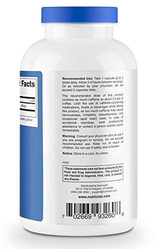Nutricost Caffeine capsules provide you with 200mg of high quality caffeine anhydrous per capsule. Nutricost strives to provide the highest quality supplements at the best prices. Overdosing on caffeine can be extremely dangerous. Do not exceed 2 capsules per day.